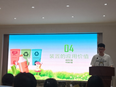 材料科学与工程公司胡成同学从项目背景、装置组成、视频展示、智能未来等四个维度介绍了智能瓶罐垃圾回收装置。他从政治环境、社会环境、经济环境和技术环境等四个方面分析了该项目的前景,认为智能瓶罐垃圾回收具有减少环境污染、创造更大价值、提高效率与节约成本方面的意义,结合视频展示讲解了装置的组成部分,包括供电装置、分类装置、压缩装置、存储装置和其他部分(LED屏幕、微信小程序返现、指示灯、语言对话功能等),另外该装置在公交车站、公园座椅和购物广场等不同场景可以有不同功能,这也是该装置的特殊之处。