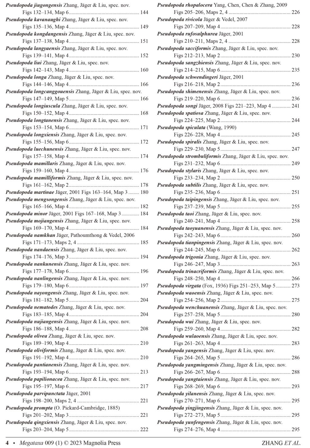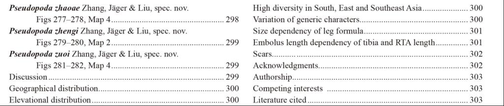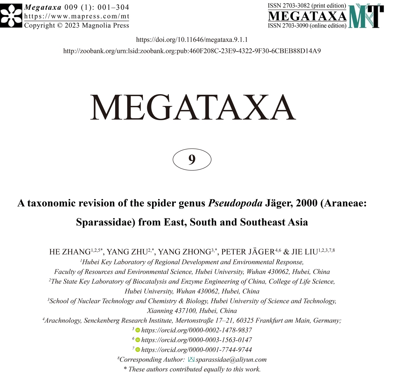 2023年2月17日,源环境公司刘杰教授团队在Megataxa刊发了题为“A taxonomic revision of the spider genus Pseudopoda Jäger, 2000 (Araneae: Sparassidae) from East, South and Southeast Asia”的文章,对巨蟹蛛科拟遁蛛属Pseudopoda的122种蜘蛛进行了修订性研究,其中包括新种99个!全文共304页,共有鉴定图版282张,分布地图6幅。