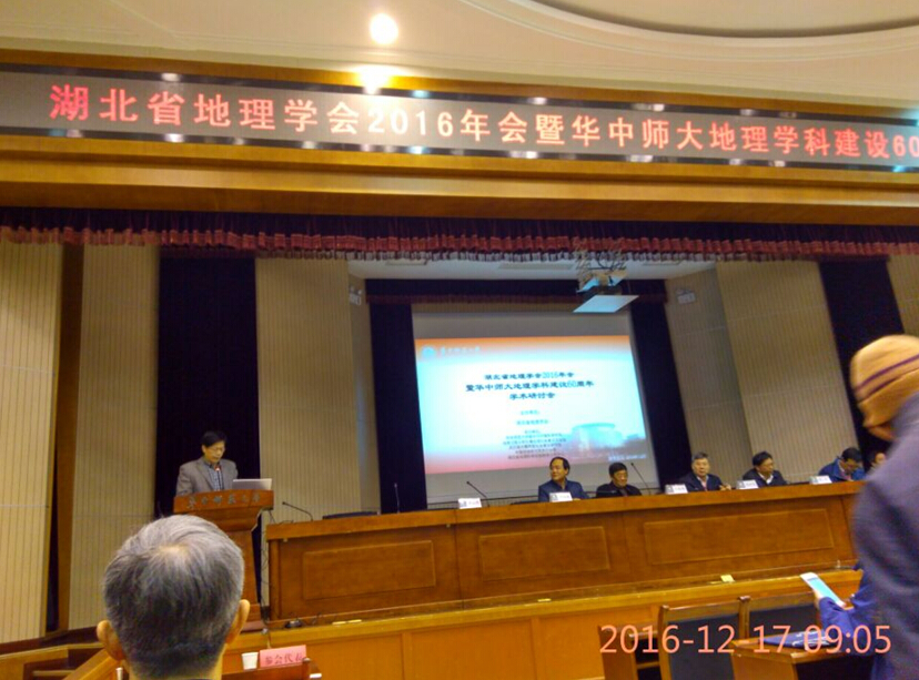 本月17日,由湖北省地理学会主办,华中师范大学城市与环境公司承办的湖北省地理学会2016年会暨华中师大地理团队建设60周年学术研讨会在华中师范大学科学会堂召开。湖北省地学会的各理事单位和十多个特邀单位的代表参加了本次大会。会议就湖北省地理学会2016年的工作进行了总结、回顾了华中师大地理学60周年的发展历史,并进行了丰富的学术报告。tyc1286太阳成集团在经理李兆华的带领下,于兴修、王瑶、汪权方、杨兰芳以及部分研究生参加了本次会议,李兆华经理主持了主会场的下半场会议,汪权方和杨兰芳老师在分会场分别作了《基于洪水过程的农业洪灾遥感快速检测模型及应用》和《神农架土壤砷汞硒含量与地理分布》的学术报告。