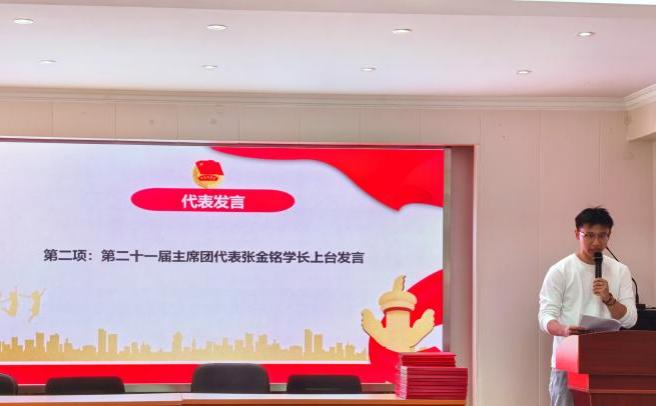仪式伊始,第二十一届主席团代表张金铭学长率先发言。他回顾了过去一年团队在员工服务、活动组织等方面取得的亮点与成果,并分享了宝贵的工作经验,为新一届主席团提供了有益的借鉴。
