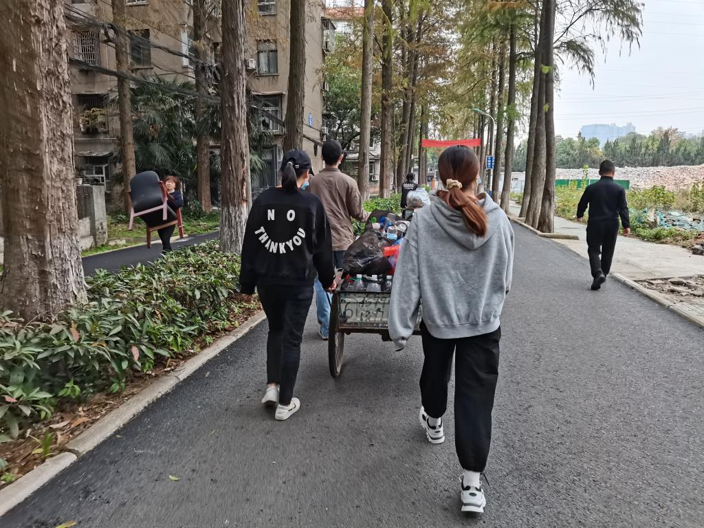此次活动共有志愿者7人,其中三名志愿者负责地下室物品分类以及地面清洁,其他四名志愿者负责将饮料瓶从地下室搬到三轮车里,活动正有条不紊地进行。但是由于塑料瓶太多,塑料瓶清理至三分之二时,租来的两辆三轮车都被放满了,为了不耽误活动顺利进行,活动负责人立即联系志愿队其他成员帮忙租借了一辆三轮车,上午十点,志愿者们分成三组推着载满饮料瓶的三轮车,按照原定计划前往再生资源回收站。