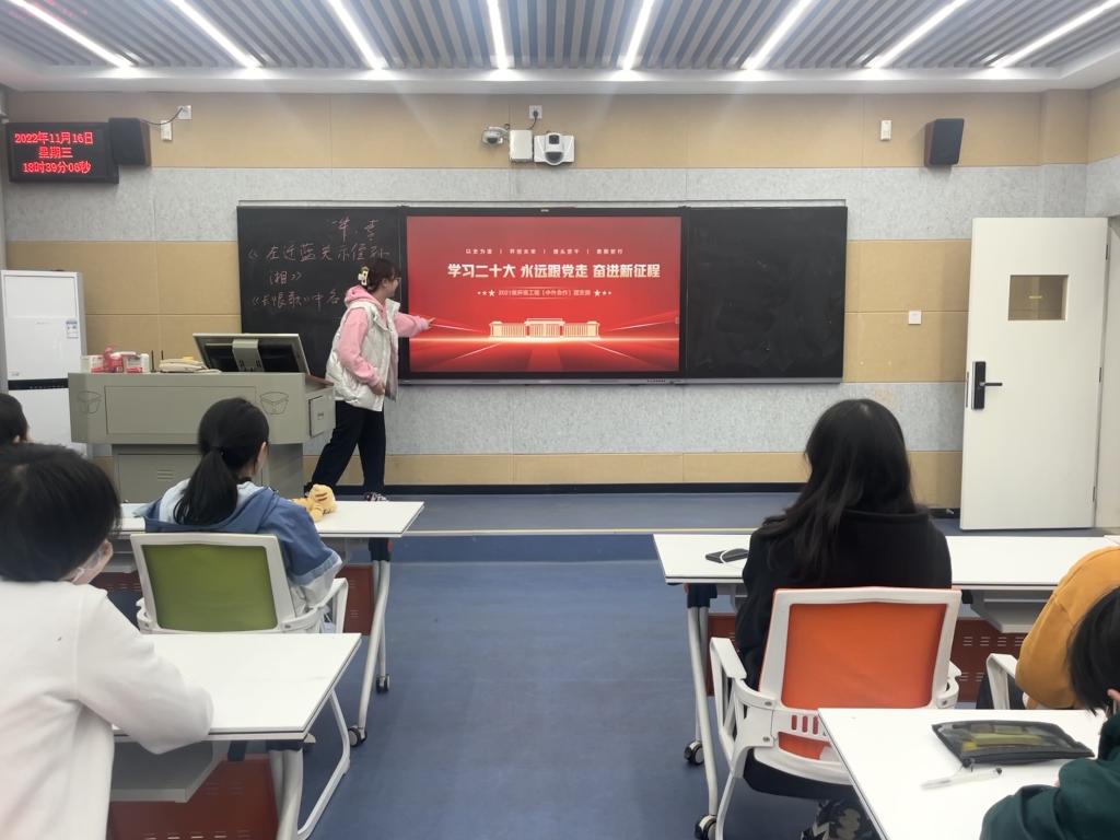 第三个环节是“分享感悟,凝聚力量”。同学们结合自身经历,从了解的人和身边的事出发,从报告中提到的与青年、教育、创新等相关的阐述中分享自己的感悟,引导同学们讨论学习党的二十大报告给自己带来的收获,将同学们的个人发展与国家需要结合起来,把个人理想融入到中华民族伟大复兴的历史进程中。