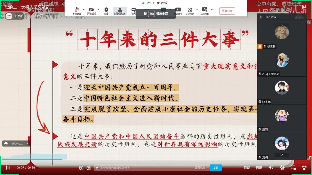 第二部分是“十年来三件大事”,刘启成同学介绍了我国十年来三件大事,一是迎来中国共产党成立100周年,二是中国特色社会主义进入新时代,三是完成脱贫攻坚、全面建成小康社会的历史任务,实现第一个百年奋斗目标。