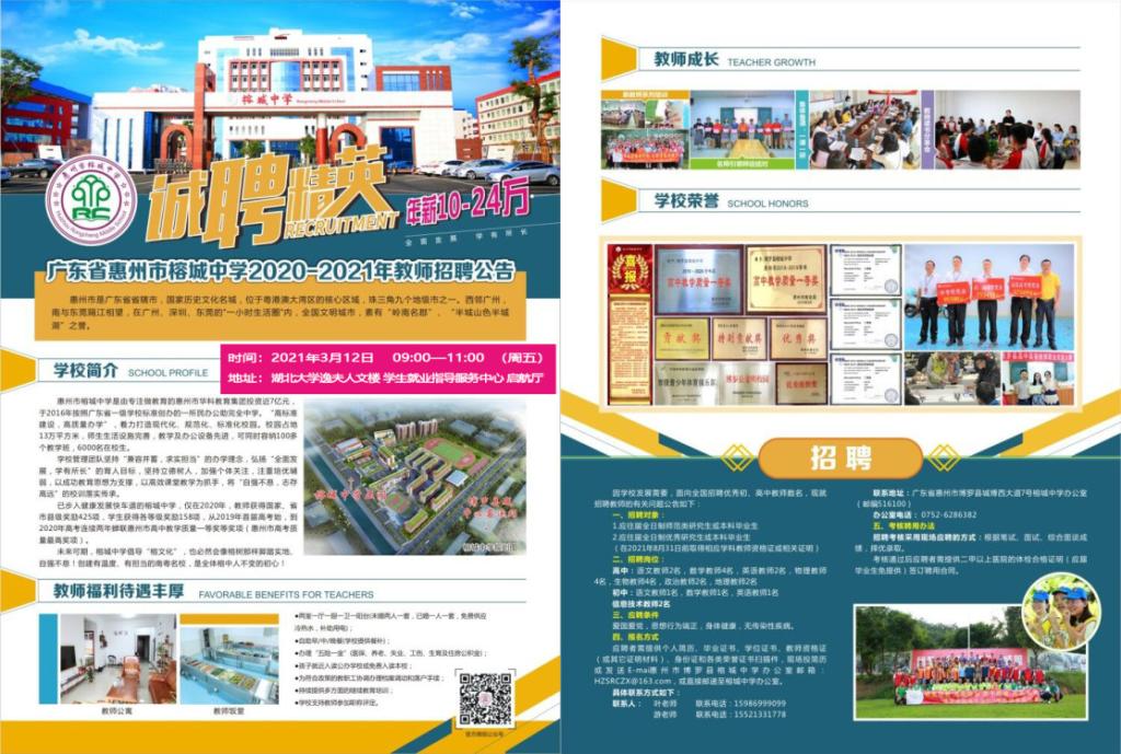 广东省惠州市榕城中学2020——2021年教师招聘 作者:发布时间:2021-03-12点击率: 广东省惠州市榕城中学2020——2021年教师招聘 公司2004级地理科学专业员工所在单位为广东省惠州市榕城中学,该员工于3月12日来校毕业生就业指导中心启航厅开展现场宣讲,就业处副处长肖志华、资环公司副书记李明、就业辅导员与该校副董事长、员工顺利对接,洽谈合作,积极推荐公司和公司相关专业毕业生前往现场应聘。